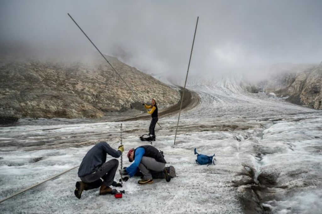 | Des membres du Réseau suisse de relevés glaciologiques (Glamos) effectuent des relevés sur le glacier Gries, le 2 septembre en Suisse. |