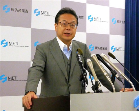 | Le ministre japonais du Commerce et de l'Industrie, Hiroshige Seko, lors d'un point de presse à Tokyo, le 8 août. |