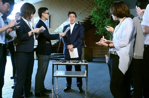| Le Premier ministre japonais Shinzo Abe s'adresse aux médias, le 31 juillet à Tokyo. |