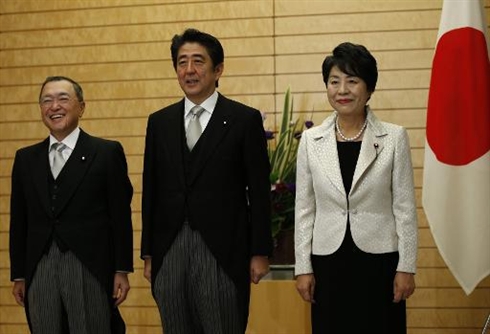 | Le nouveau ministre japonais de l'Industrie, Yoichi Miyazawa (gauche), en compagnie de Premier ministre Shinzo Abe et de la nouvelle ministre de la Justice, Yoko Kamikawa. |