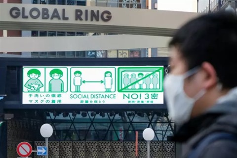 | Un homme portant un masque passe devant un tableau d'affichage demandant de respecter des distances, à Tokyo, le 7 janvier. |