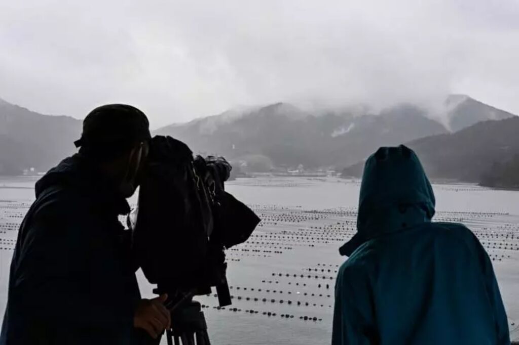 | Des personnes observent des volutes de fumée s'échappant d'une montagne, près de la ville d'Ofunato, dans la région japonaise d'Iwate, le 5 mars. |