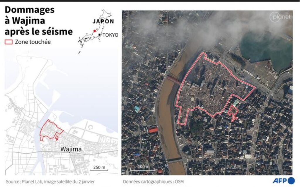 La secousse de magnitude 7,5 survenue lundi à 16h10 locales (07h10 GMT) a été ressentie jusqu'à Tokyo, à 300 km de là. Elle a ébranlé la péninsule de Noto, une fine bande de terre qui s'avance d'une centaine de kilomètres dans la mer du Japon, faisant s'écrouler des bâtiments et dévastant les routes.