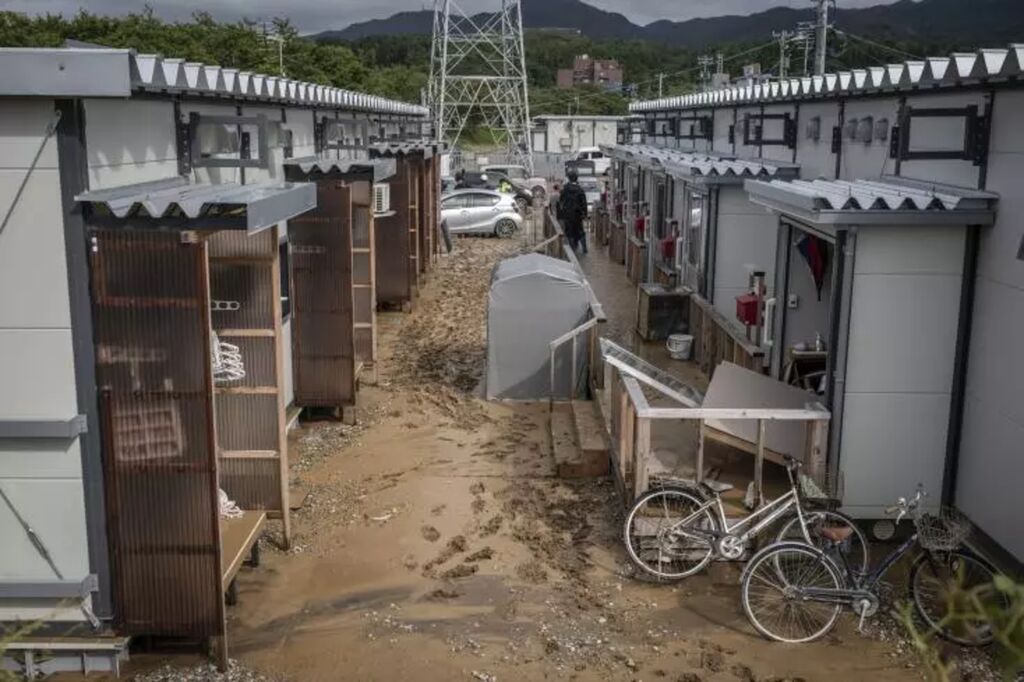 | Des logements temporaires construits pour les personnes ayant perdu leur maison lors du séisme du 1er janvier sont recouverts de boue après les fortes pluies ayant frappé Wajima, au Japon, le 22 septembre. |