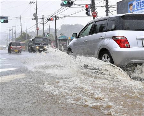 | Une rue inondée le 22 août à Yokohama, près de Tokyo. |