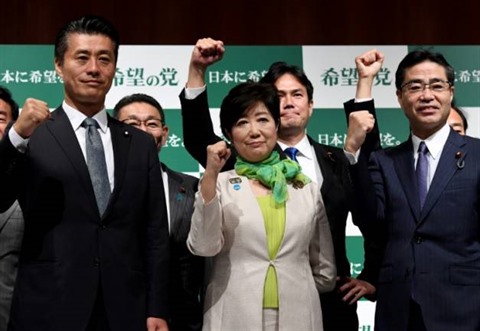 | La gouverneure de Tokyo, Yuriko Koike, avec les membres du Parti de l'Espoir, pendant une conférence de presse à Tokyo, le 27 septembre. |