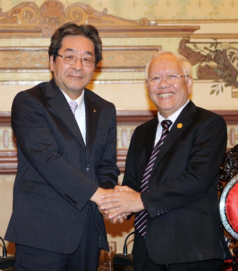 | Le président du Comité populaire de Hô Chi Minh-Ville, Lê Hoàng Quân (droite), et le maire-adjoint de la ville japonaise d'Osaka, Seigo Tanaka, le 15 janvier dans la mégapole du Sud. |