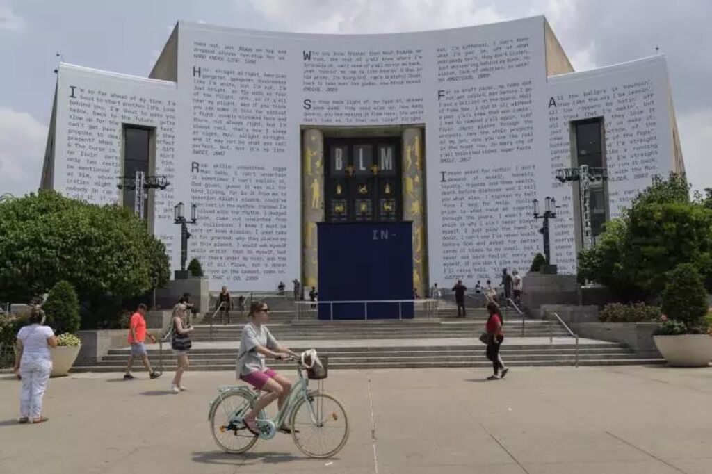 | La façade de la grande bibliothèque de Brooklyn, sur laquelle s'affichent des textes du rappeur Jay-Z, à New York le 17 juillet 2023. |