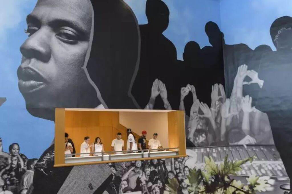 À l'intérieur de la bibliothèque, une vaste et élogieuse exposition retrace la carrière emblématique de l'enfant de Brooklyn, qui a construit sa légende comme un conte de fées moderne : ancien dealer des "Marcy Projects", la cité HLM où il a grandi, Shawn Corey Carter - alias Jay-Z - est devenu dans les années 1990 et 2000 l'un des plus grands rappeurs américains, puis un homme d'affaires milliardaire à la tête d'un empire du divertissement, Roc Nation, qui a conçu la rétrospective.