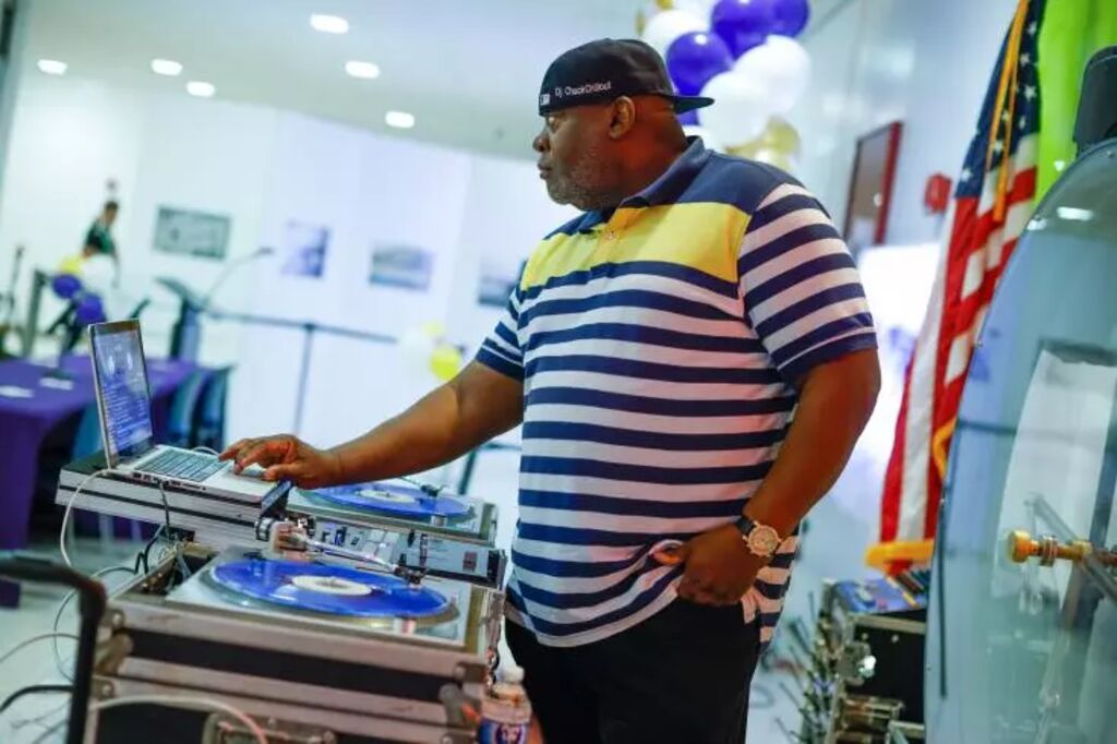 | DJ Chuck Chillout fait tourner les platines à la bibliothèque du Queens, à New York, le 13 juillet 2023, dans le cadre des célébrations des 50 ans du hip-hop. |