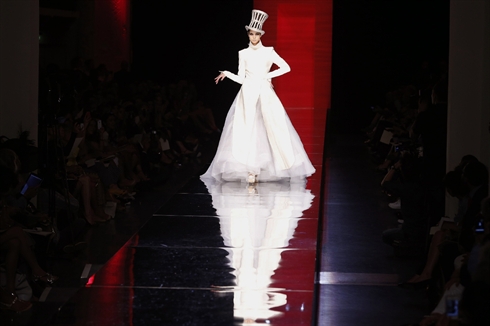 Plusieurs hommes s'immiscent ensuite, comme souvent chez Gaultier, dans ce défilé de haute couture, un artisanat par définition féminin.
