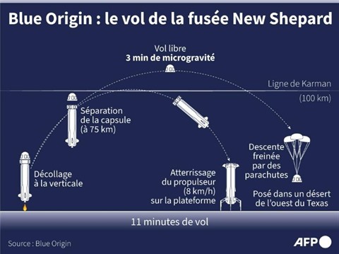 Schéma explicatif des différentes étapes du vol de la fusée New Shepard de Blue Origin. Photo : AFP/VNA/CVN |