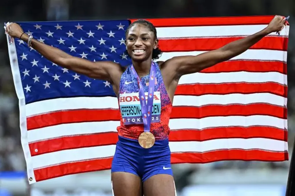 | L'Américaine Melissa Jefferson-Wooden a remporté l'or sur 100 m, en 10 sec 61, aux championnats du monde de Tokyo, le 14 septembre. |