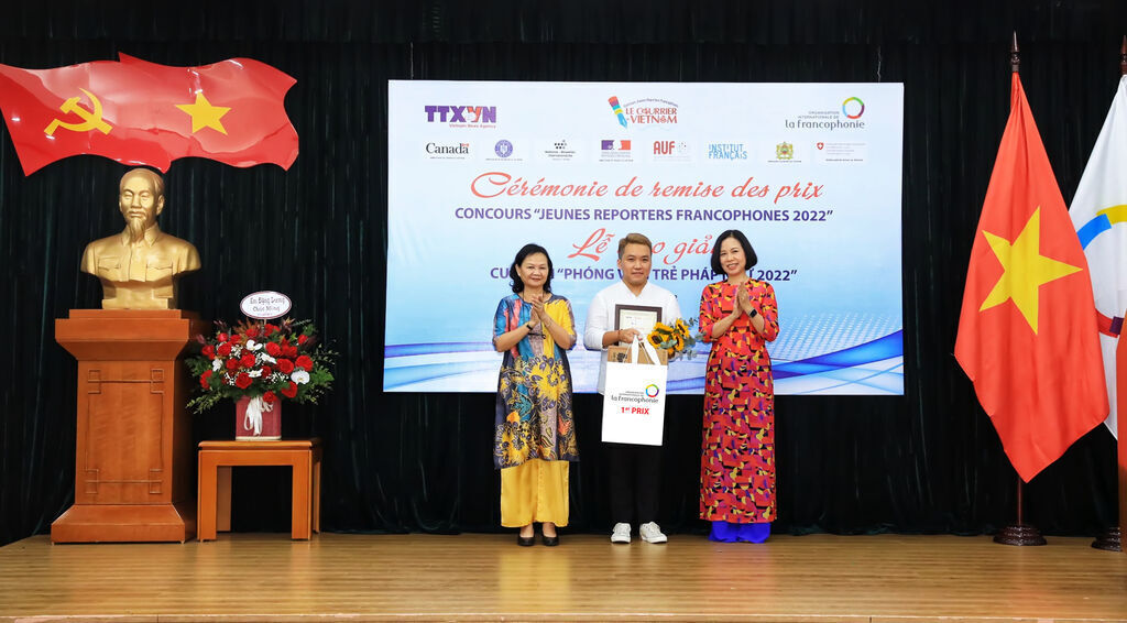 | Mme Trân Thi Mai Yên, représentante régionale a.i pour l’Asie et le Pacifique de l’Organisation internationale de la Francophonie (gauche), et Mme Vu Viêt Trang, directrice générale de l’Agence Vietnamienne d’Information, décernent le Premier Prix à Hô Ngoc Vinh Nguyên, le 4 novembre 2022. |