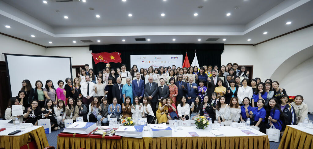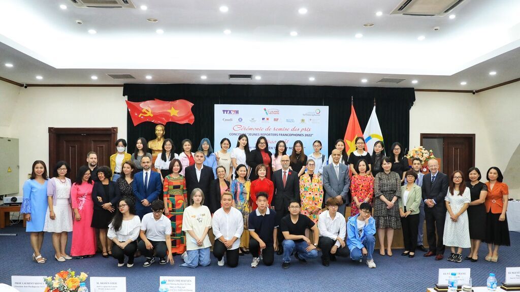 | Photo de participants à la cérémonie de remise des prix du concours “Jeunes Reporters Francophones 2022”, le 4 novembre 2022 à Hanoï. |