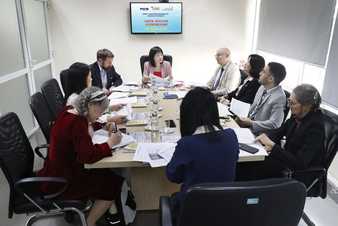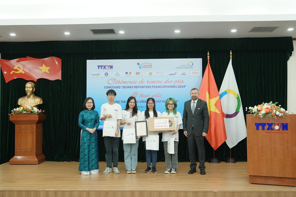 | Le groupe d'auteurs reçoit le 1er Prix en 2024, remis par le représentant régional pour l'Asie et le Pacifique de l'OIF, Edgar Doerig, et la directrice générale adjointe de la VNA, Đoàn Thi Tuyêt Nhung. |
