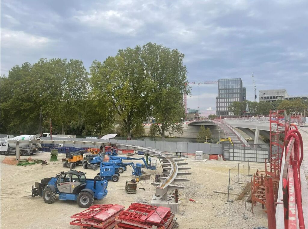 | Au village des athlètes encore en chantier, en Seine-Saint-Denis, une grande rampe d'accès accessible à tous permettra de relier l'île Saint-Denis au métro. |