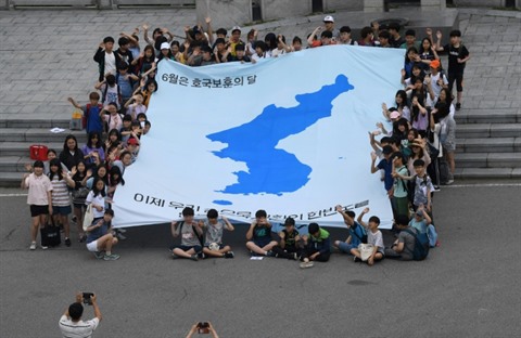 | Des étudiants déploient un drapeau représentant les deux Corées réunifiées, le 11 juin à Paju en Corée du Sud. |