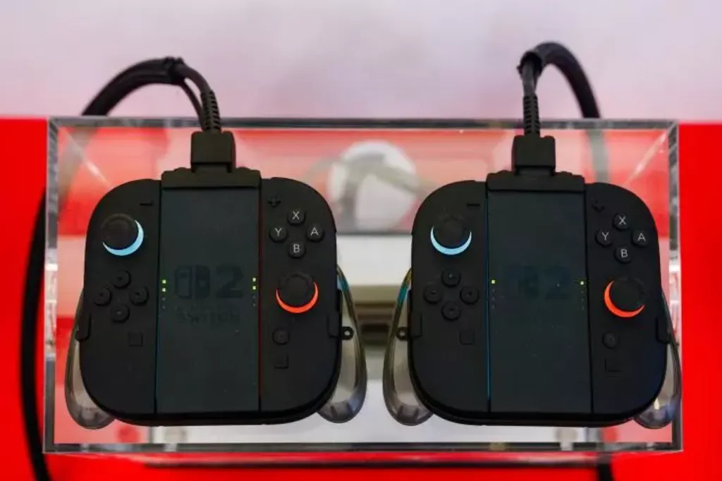 | Les manettes amovibles Joy-con pour la console de jeux vidéo Nintendo Switch 2 exposées au Grand Palais à Paris, le 2 avril. |