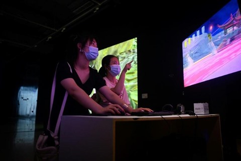 | Deux jeunes filles jouant à des jeux vidéos dans un musée de Pékin, le 12 août. |