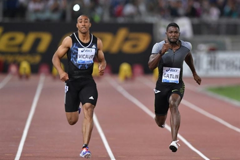 | Jimmy Vicaut au coude à coude avec l'Américain Justin Gatlin lors du meeting Ligue de diamant de Rome, le 2 juin. |