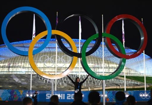 | Une femme pose sous les anneaux olympiques, le 6 février à Sotchi. |