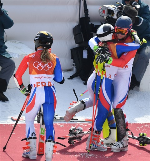 | Alexis Pinturault serre Tessa Worley dans ses bras (droite) lors de la défaite en ski alpin aux JO de Pyeongchang le 24 février 2018. |