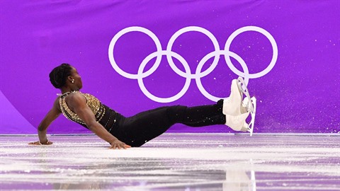 | La Française Maé Bérénice Méité chute lors de l'épreuve par équipes des JO de Pyeongchang le 11 février. |