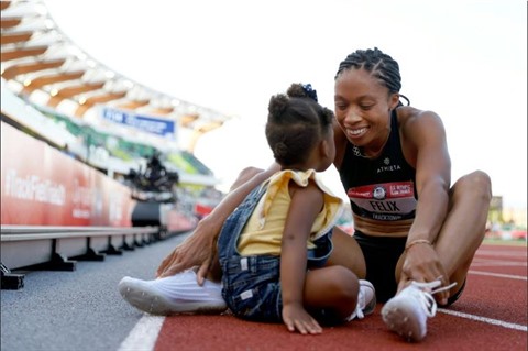 | L'emblématique Allyson Felix célèbre sa 2e place sur 400m aux sélections olympiques américaines avec sa fille Camryn, le 20 juin à Eugene. |