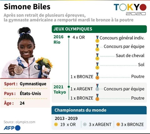 | Fiche sur Simone Biles, qui a remporté l'argent par équipe et le bronze en individuel à la poutre aux Jeux de Tokyo. |
