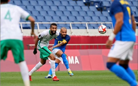 | Le défenseur brésilien Dani Alves (droite) au marquage du milieu saoudien Salman al-Faraj lors du match des JO de Tokyo, le 28 juillet. |