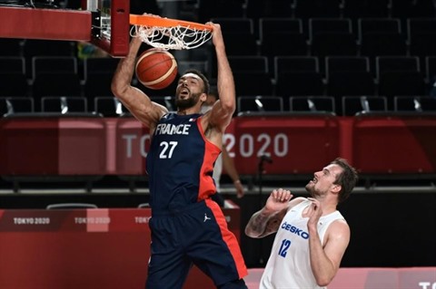 | Le pivot français Rudy Gobert (gauche) dunke sous le regard du Tchèque Ondrej Balvin, lors de leur match du 1er tour, le 28 juillet aux JO de Tokyo. |
