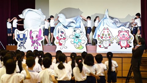 | Trois paires de mascottes olympiques officielles pour les JO-2020 dévoilées à l'école primaire de Kakezuka à Tokyo |