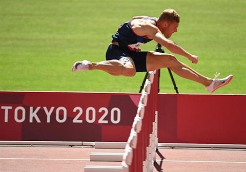 | Le Français Kevin Mayer lors de l'épreuve de décathlon du 110m haies des Jeux olympiques de Tokyo, le 5 août. |