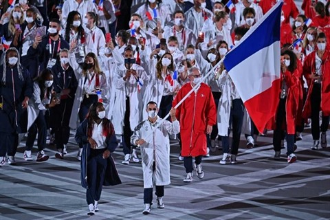 | Les porte-drapeaux français Clarisse Agbegnenou et Samir Ait Said mènent la délégation française lors de la cérémonie d'ouverture des Jeux olympiques de Tokyo, le 23 juillet. |