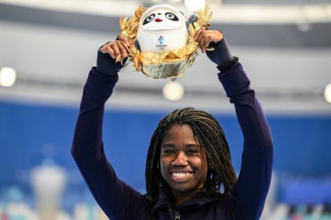 | L'Américaine Erin Jackson sacrée en patinage de vitesse sur 500 m aux Jeux de Pékin, le 13 février. |