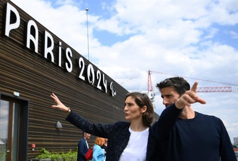 | La ministre des Sports, Amélie Oudea-Castera, et le président du comité d'organisation des JO de Paris de 2024, Tony Estanguet, lors d'une visite du siège du Cojo à Saint-Denis, le 31 mai. |