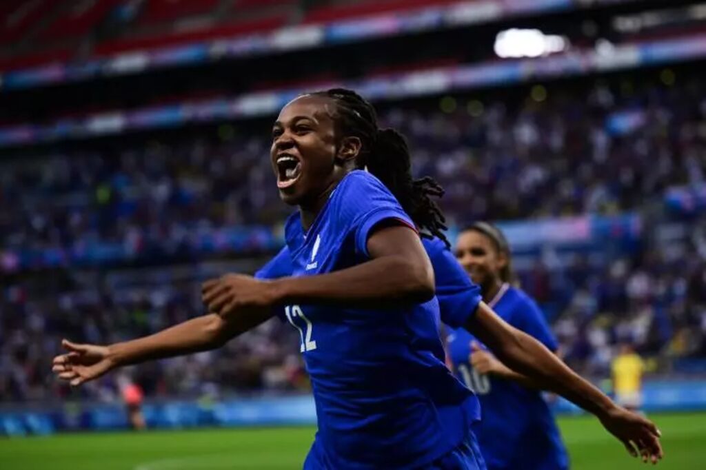 | L'attaquante française Marie-Antoinette Katoto qui a réussi un doublé contre la Colombie, le 25 juillet à Lyon. |