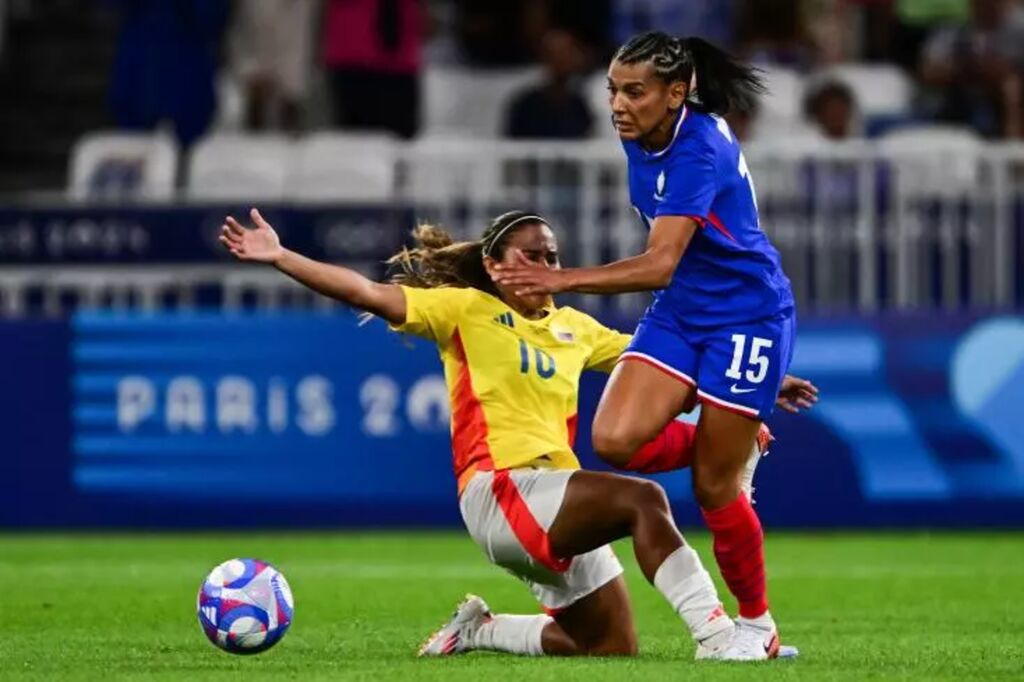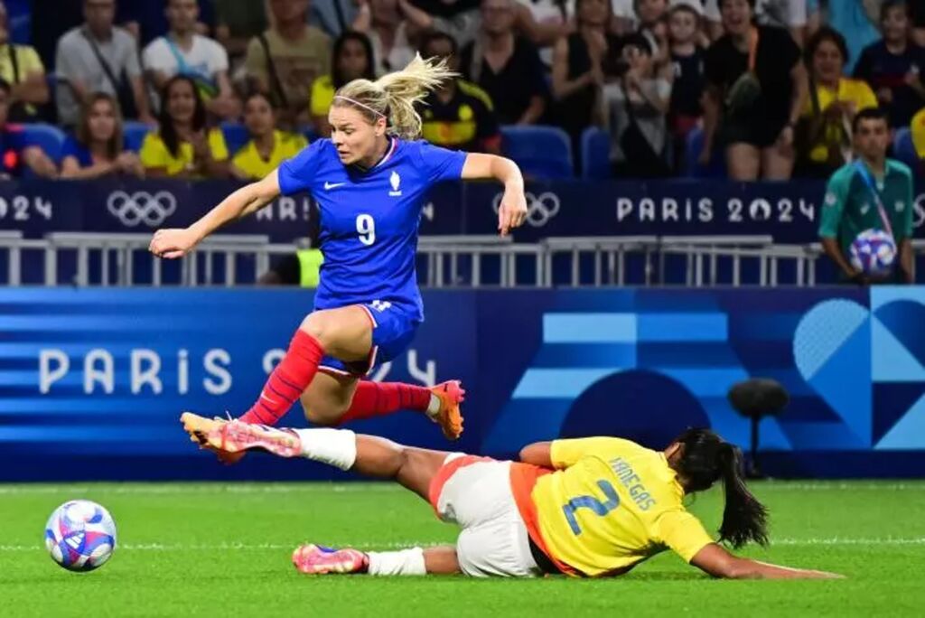 | La Française Kenza Dali (droite) taclée par la Colombienne Leicy Santos, le 25 juillet à Lyon. |