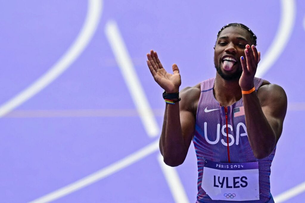 | Le sprinteur américain Noah Lyles le 3 août lors des séries du 100m des JO de Paris, au stade de France à Saint-Denis. |