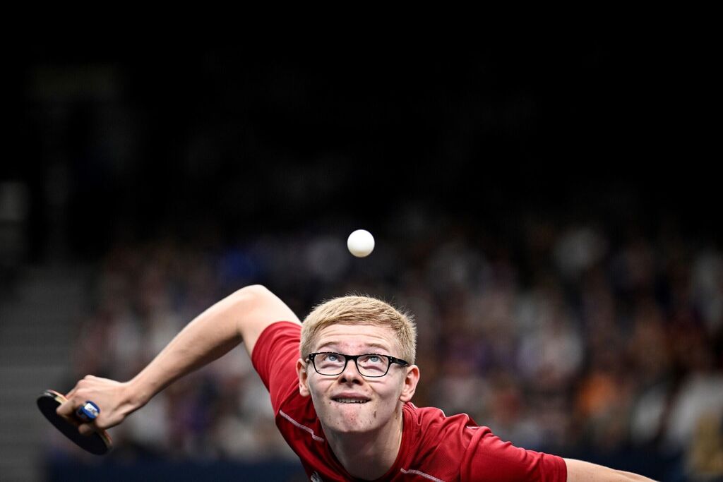 | Le pongiste français Félix Lebrun le 28 juillet aux JO de Paris, à l'Arena Paris Sud. |