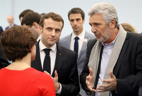 | Le président français Emmanuel Macron et Claude Onesta, chargé de la haute performance à l'Agence nationale du sport, discutent avec Roxana Maracineanu, ministre déléguée aux Sports, le 9 janvier 2019 à Créteil, lors de l'inauguration d'un nouveau stade de handball. |