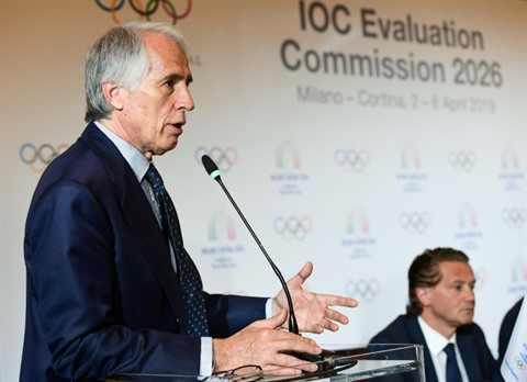 | Le président du Comité olympique italien (CONI), Giovanni Malago, à l'issue de la visite de la Commission d'évaluation du CIO, le 6 avril à Milan. |