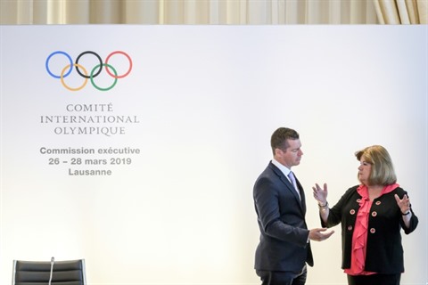 | La Suèdoise Gunilla Lindberg, membre du CIO, et le directeur des Sports Kit McConnell, le 26 mars à Lausanne. |