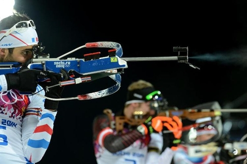 | Le biathlète français Martin Fourcade (gauche) lors de la poursuite aux JO de Sotchi, le 10 février. |