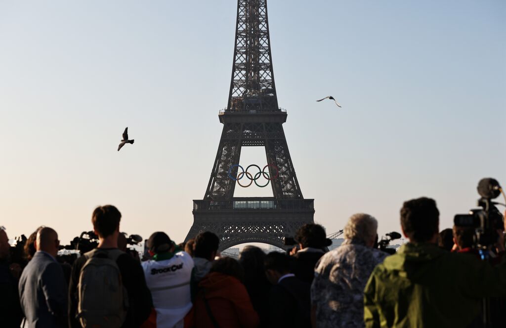 | Le symbole des Jeux olympiques 2024 accroché sur la tour Eiffel. |