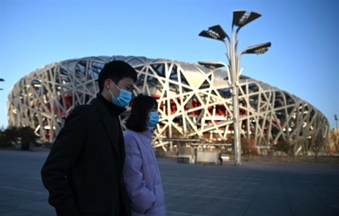 | Un couple passe devant le stade du "Nid d'Oiseau", le 3 février à Pékin, où auront lieu les cérémonies d'ouverture et de clôture des Jeux olympiques de Pékin 2022. |