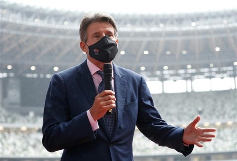 | Le président de la Fédération internationale d'athlétisme (World Athletics), le Britannique Sebastian Coe, lors de sa visite au National Stadium, le 8 octobre 2020 à Tokyo. |