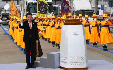 | Le Premier ministre sud-coréen Lee Nak-Yon (1er plan, à gauche) porte la flamme olympique, le 1er novembre à Séoul, lors d'une cérémonie pour son arrivée en Corée du Sud. |