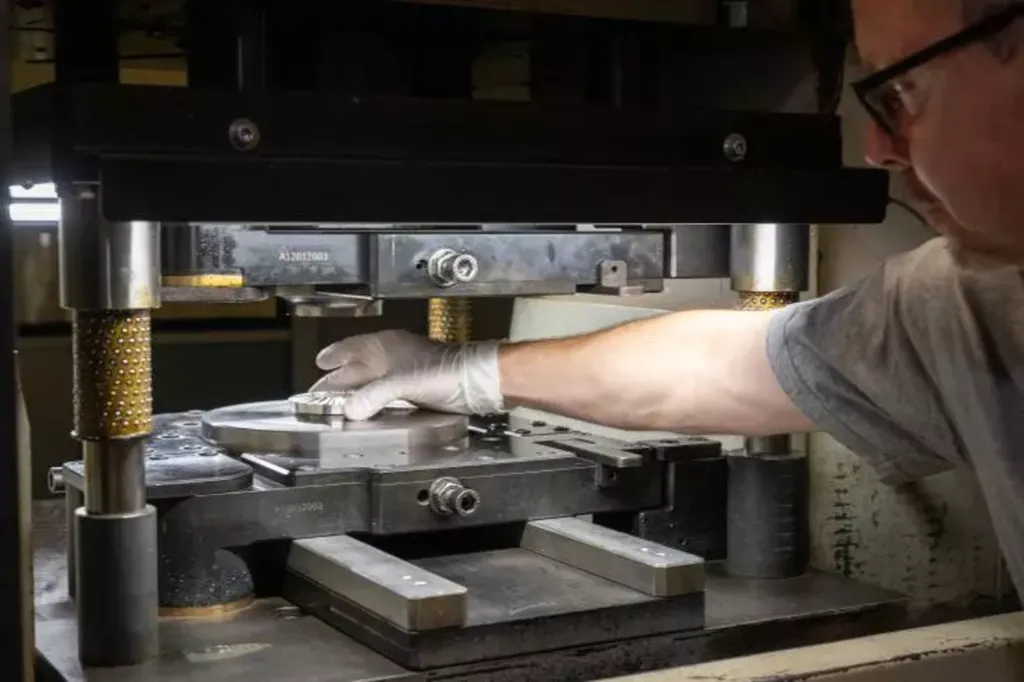 | Un employé tient une médaille pour les Jeux olympiques et paralympiques de Paris après la phase d'ébauche dans les ateliers de la Monnaie de Paris. |